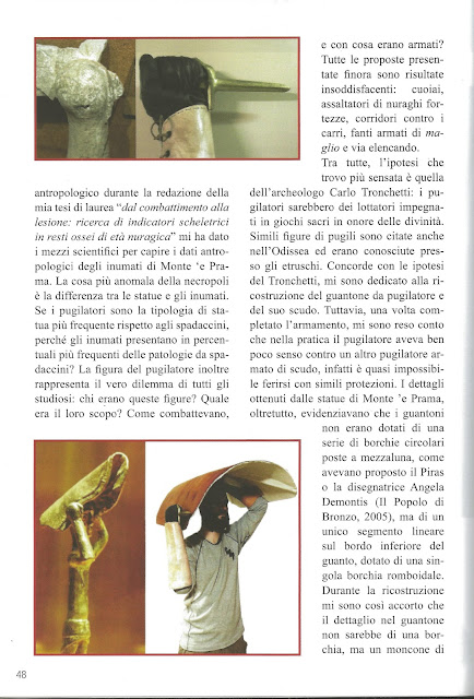 Recentemente ho notato una riproposizione di questa teoria da più parti. Alcuni si sono occupati di realizzare l'attrezzatura del "pugilatore", come lo scudo ed il guantone. Tutto molto bello, chiunque può sentirsi libero di replicare quello che vede realizzato nelle statue nuragiche. Infatti, personalmente, ho iniziato lo studio della ricostruzione marziale nuragica dal 2009, quando il gruppo Memoriae Milites fece una prima rievocazione nei locali del museo archeologico Nazionale di Cagliari, in seguito ripetuta nel tempo, tra cui anche una mostra in quel di Solanas con l'autore Montalbano. Mi dispiace chi professa di fare questo tipo di cose da 10, 20 anni prima del sottoscritto e del gruppo di cui sono membro, ma di queste persone al tempo non si vedeva manco l'ombra, e di certo non è nota alcuna partecipazione pubblica o privata in mostre o convegni. Quindi, con tutta la bontà che si può avere, iniziamo allora a mettere dei paletti...!
